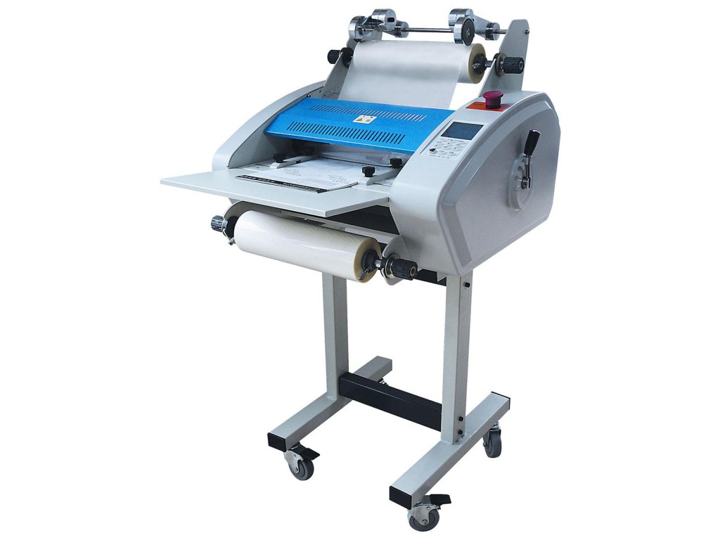 Конструкция ламинатора позволяет очень быстро и просто осуществлять замену рулонов и автоматически поддерживать режим натяжения плёнки. Горячий верхний вал закрывается защитным металлическим кожухом.