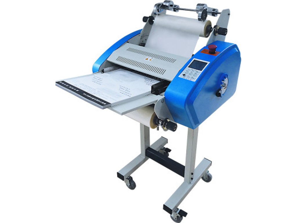 Конструкция ламинатора позволяет очень быстро и просто осуществлять замену рулонов и автоматически поддерживать режим натяжения плёнки. Горячий верхний вал закрывается защитным металлическим кожухом.